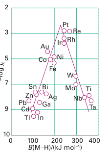 Figure 26.28 The rate of H2 evolution expressed as the logarithm of the exchange current density plotted against M H bond energy.