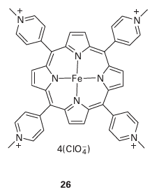 Ruthenium dioxide is an effective catalyst for both O2 and Cl2 evolution and it also is a good electrical conductor. It turns out that at high current densities RuO2 is more effective for the catalysis of Cl2 evolution than for O2 evolution. RuO2 is therefore extensively used as an electrode material in the commercial production of chorine. The electrode processes that contribute to this subtle catalytic effect do not appear to be well understood. There is great interest in devising new catalytic electrodes, particularly ones that de crease the O2 overpotential on surfaces such as graphite. Thus, tetrakis(4-N-methylpyridyl) porphyriniron (II), [Fe(TMPyP)]4+(26), has been deposited on the exposed edges of graphite electrodes (on which O2 reduction requires a high overpotential) and the resulting electrode surface was found to catalyse the electrochemical reduction of O2 . A plausible explanation for this catalysis is that [FeIII (TMPyP)] attached to the electrode (indicated below by an asterisk) is first reduced electrochemically: