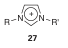 Key point: Biphasic systems offer another way of combining the selectivity of homogeneous catalysts with the ease of separation of heterogeneous catalysts. Another popular method of attempting to combine the best of both homogeneous and heterogeneous catalysts has been the use of two liquid phases that are not miscible at room temperature but are miscible at higher temperatures. The existence of immiscible aqueous/ organic phases together with a compound that facilitates the transfer of reagents between the two phases will be familiar; two other systems worthy of note are ionic liquids and the ‘fluorous biphase’ system. Ionic liquids are typically derived from 1,3-dialkylimidazolium cations (27) with counter ions such as PF-6, BF-4, and CF3SO-3. These systems have melting points of less than (and often much less than) 100ºC, a very low viscosity, and an effectively zero vapour pressure. If it can be arranged that the catalysts are preferentially soluble in the ionic phase (for instance, by making them ionic), immiscible organic solvents can be used to extract organic products. As an example, consider the hydroformylation of alkenes by a Rh cata lyst with phosphine ligands. When the ligand used is triphenylphosphine, the catalyst is extracted from the ionic liquid together with the products. However, when an ionic sulfonated triphenylphosphine is used as the ligand, the catalyst remains in the ionic liquid and product separation from the catalyst is complete. It should be borne in mind that the ionic liquid phase is not always unreactive, and may induce alternative reactions. The fluorous biphase system, which typically consists of a fluorinated hydrocarbon and a ‘normal’ organic solvent such as methylbenzene, offers two principal advantages over aqueous/organic phases: the fluorous phase is unreactive, so sensitive groups (such as hydrolytically unstable groups) are stable in it, and polyfluorinated and hydrocarbon solvents, which are not miscible at room temperatures, become so on heating, giving rise to a gen- uinely homogeneous system. A catalyst that contains polyfluorinated groups is preferentially