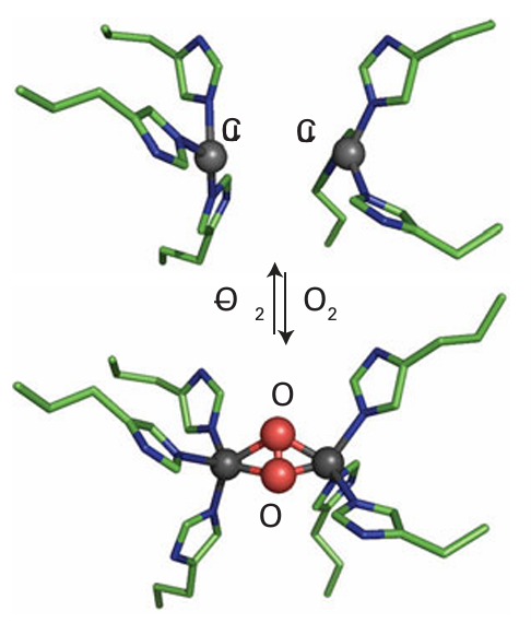 Figure 27.19 Binding of O2 at the active site of haemocyanin causes the two Cu atoms to be brought closer together. The O2 complex is regarded as a binuclear Cu(II) centre in which the two Cu atoms are bridged by an n2, n2-peroxide.