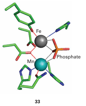 Acid phosphatases, sometimes known as ‘purple’ acid phosphatases (PAPs) on account of their intense colour, occur in various mammalian organs, particularly the bovine spleen and porcine uterus. Acid phosphatases catalyse hydrolysis of phosphate esters, with op-timal activity under mild acid conditions. They are involved in bone maintenance and hydrolysis of phosphorylated proteins (therefore they are important in signalling). They may also have other functions, such as Fe transport. The pink or purple colours of acid phosphatases are due to a tyrosinate → Fe (III) charge-transfer transition at 510–550 nm (ε=4000 dm3 mol–1 cm–1). The active site contains two Fe atoms linked by ligands, similar to haemerythrin (21). Acid phosphatases are inactive in the oxidized {Fe (III)Fe (III)} state in which they are often isolated. In the active state, one Fe is reduced to Fe (II). Both Fe atoms are high spin and remain so throughout the various stages of reactions. Acid phosphatases also occur in plants, and in these enzymes the reducible Fe is replaced by Zn or Mn. The active site of an acid phosphatase from sweet potato (33) shows how phosphate becomes coordinated to both Fe (III) and Mn (II) ions. In the mechanism shown in Fig. 27.32, rapid binding of the phosphate group of the ester occurs to the M(II) sub site, then the P atom is attacked by an OH– ion that is formed at the more acidic Fe (III) subsite. The FeZn centre is also found in an important enzyme called calcineurin, which catalyses the phosphorylation of serine or threonine residues on certain protein surfaces, in particular a transcription factor involved in controlling the immune response. Calcineurin is activated by Ca2 binding, both directly and through calmodulin. Aconitase is an essential enzyme of the tricarboxylic acid cycle (also known as the Krebs cycle, or citric acid cycle), the main source of energy production in higher organisms, where it catalyses the interconversion of citrate and isocitrate in a reaction that formally involves dehydration and rehydration, and proceeds through an intermediate, aconitate, which is released in small amounts: