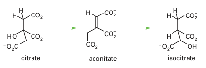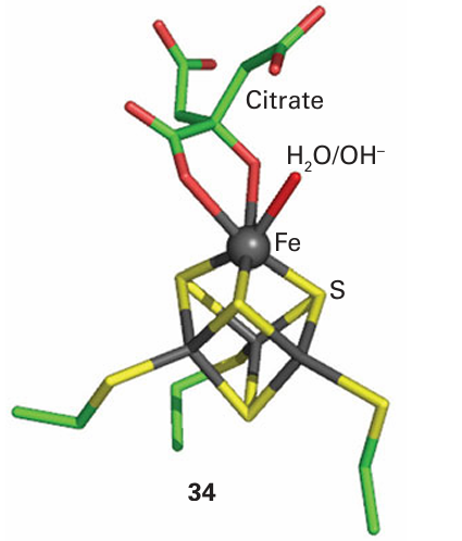 The active form of the enzyme contains a [4Fe–4S] cluster, which degrades to [3Fe–4S] when the enzyme is exposed to air. The site of catalysis is the Fe atom that is lost on oxida tion. The structure shows that this unique subsite is not coordinated by a protein ligand but by an H2 O molecule, which explains why this Fe is more readily removed. A plausible mechanism for the action of aconitase, based on structural, kinetic, and spectroscopic evidence, involves the binding of citrate to the active Fe subsite, which increases its coordination number to 6. An intermediate in the catalytic cycle is ‘captured’ for X-ray diffraction investigation, using a site-directed mutant that can bind the citrate but cannot complete the reaction (34). The Fe atom polarizes a C–O bond and OH is abstracted, while a nearby base accepts a proton. The substrate now swings round, and the OH and H are reinserted onto different positions. A form of aconitase that is found in cytoplasm has another intriguing role, that of an Fe sensor (Section 27.15).