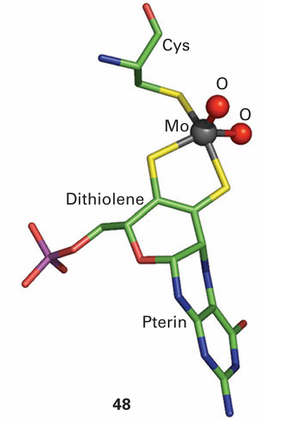 Key points: Mo is used to catalyse O atom transfer in which the O atom is provided by a water molecule; related chemistry, but in more reducing environments, is displayed by W. Molybdenum and tungsten are the only heavier elements known so far to have specific functions in biology. Molybdenum is widespread across all life forms, and this section deals with its presence in enzymes other than nitrogenase (Section 27.13). By contrast, W has so far only been found in prokaryotes. Molybdenum enzymes catalyse the oxidation and reduction of small molecules, particularly inorganic species. Reactions include oxidation of sulfite, arsenite, xanthine, aldehydes, and carbon monoxide, and reduction of nitrate and dimethyl sulfoxide (DMSO). Both Mo and W are found in combination with an unusual class of cofactors (11), at which the metal is coordinated by a dithiolene group. In higher organisms, Mo is coordinated by one pterin dithiolene along with other ligands that often include cysteine. This is illustrated by the active site of sulfite oxidase, where we see also how the pterin ligand is twisted (48). In prokaryotes, Mo enzymes have two pterin cofactors coordinated to the metal atom and although the role of such an elaborate ligand is not entirely clear, it is potentially redox active and may mediate long-range electron transfer. Coordination of the