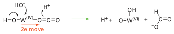 Mo is usually completed by ligands derived from H2O, specifically H2O itself, OH, and O2. Molybdenum is suited for its role because it provides a series of three stable oxida-tion states, Mo(IV), Mo(V), and Mo(VI), related by one-electron transfers that are coupled to proton transfer. Typically, Mo(IV) and Mo(VI) differ in the number of oxido groups they contain, and Mo enzymes are commonly considered to couple one-electron transfer reactions with O-atom transfer. In humans and other mammals, an inability to synthesize molybdenum cofactor has serious consequences. Sulfite oxidase deficiency is a rare, inherited defect (sulfite ions are very toxic) and it is often fatal. A mechanism often considered for Mo enzymes is direct O-atom transfer, which is illustrated in Fig. 27.43 for sulfite oxidase. The S atom of the sulfite ion attacks an electron-deficient O atom coordinated to Mo (VI), leading to Mo–O bond cleavage, formation of Mo (IV), and dissociation of SO4 2–. Reoxidation back to Mo (VI), during which a trans ferable O atom is regained, occurs by two one-electron transfers from an Fe-porphyrin that is located on a mobile ‘cytochrome’ domain of the enzyme (Fig. 27.44). The inter mediate state containing Mo(V) (d1) is detectable by EPR spectroscopy. This kind of oxygenation reaction can be distinguished from that of the Fe and Cu enzymes described previously, because with Mo enzymes the oxido group that is trans ferred is not derived from molecular O2 but from water. The Mo (VI) O unit can trans fer an O atom, either directly (inner sphere) or indirectly to reducing (oxophilic) substrates, such as SO32– or AsO32–, but cannot oxygenate C H bonds. Figure 27.45 shows the reaction enthalpies for O-atom transfer: we see that the highly oxidizing Fe species formed by reaction with O2 are able to oxygenate all substrates, whereas Mo (VI) oxo species are limited to more reducing substrates and Mo (IV) is able to extract an O atom from nitrate. As expected from its position below Mo in Group 6, the lower oxidation states of W are less stable than those of Mo, so W(IV) species are usually potent reducing agents. This potency is illustrated by the W-containing formate dehydrogenases present in certain primitive organisms, which catalyse the reduction of CO2 to formate, the first stage in non-photosynthetic carbon assimilation. This reaction does not involve O-atom insertion but rather the formation of a C-H bond. One mechanism that has been proposed is