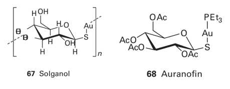 Key point: Complexes of Au are effective against rheumatoid arthritis. Gold drugs are used in the treatment of rheumatoid arthritis, an inflammatory disease that affects the tissue around joints. The inflammation arises by the action of hydrolytic enzymes in cell compartments known as lysosomes that are associated with the Golgi apparatus (see Fig. 27.1). Although the mechanism of action is not established, it is known that Au accumulates in the lysosomes, and it is therefore possible that Au inhibits these O 64 N 65 Bleomycin hydrolytic enzymes. Another hypothesis is that Au(I) compounds deactivate singlet O2, a harmful species that can be formed by oxidation of superoxide. The mechanism for this reaction might involve promotion of intersystem crossing by the high spin-orbit coupling constant of the heavy element. Commonly administered drugs include sodium aurothiomalate (‘myochrisin’, 66), sodium aurothioglucose (‘solganol’, 67; the linkage between units is uncertain), and others, all of which feature Au(I) with linear coordination. Many are water-soluble polymers, but they cannot be administered orally because they undergo acid hydrolysis in the stomach. By contrast, the compound known as auranofin (68) can be given orally. Because Au(I) is chemically soft it is likely that it targets sulfur groups such as cysteine side chains in proteins. It is much more likely to survive in biological environments than Au (III), which is highly oxidizing. As expected, Au compounds lead to side effects, which include skin allergies as well as kidney and gastrointestinal problems.
