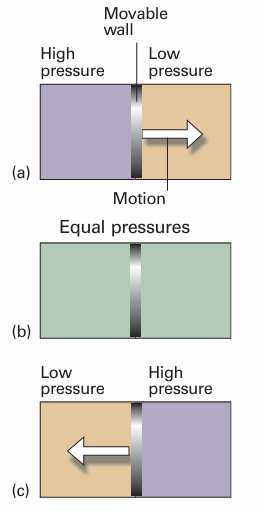 Fig. 1.1When a region of high pressure is separated from a region of low pressure by a movable wall, the wall will be pushed into one region or the other, as in (a) and (c). However, if the two pressures are identical, the wall will not move (b). The latter condition is one of mechanical equilibrium between the two regions.
