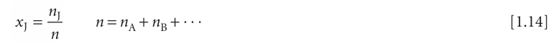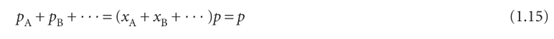 When no J molecules are present, xJ = 0; when only J molecules are present, xJ = 1. It follows from the definition of xJ that, whatever the composition of the mixture, xA+xB+· · · =1 and therefore that the sum of the partial pressures is equal to the total pressure: