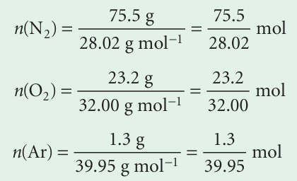 These three amounts work out as 2.69 mol, 0.725 mol, and 0.033 mol, respectively, for a total of 3.45 mol. The mole fractions are obtained by dividing each of the above amounts by 3.45 mol and the partial pressures are then obtained by multi plying the mole fraction by the total pressure (1.00 atm):