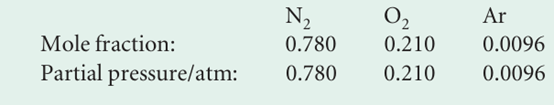 The mass percentage composition of dry air at sea level is approximately N2: 75.5; O2: 23.2; Ar: 1.3. What is the partial pressure of each component when the total pressure is 1.00 atm? Method We expect species with a high mole fraction to have a proportionally high partial pressure. Partial pressures are defined by eqn 1.13. To use the equation, we need the mole fractions of the components. To calculate mole fractions, which are defined by eqn 1.14, we use the fact that the amount of molecules J of molar mass MJ in a sample of mass mJ is nJ= mJ/MJ. The mole fractions are independent of the total mass of the sample, so we can choose the latter to be 100 g (which makes the conversion from mass percentages very easy). Thus, the mass of N2 present is 75.5 per cent of 100 g, which is 75.5 g. Answer The amounts of each type of molecule present in 100 g of air, in which the masses of N2, O2, and Ar are 75.5 g, 23.2 g, and 1.3 g, respectively, are