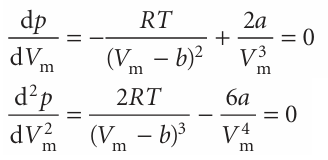 The principal features of the van der Waals equation can be summarized as follows. (1) Perfect gas isotherms are obtained at high temperatures and large molar volumes. When the temperature is high, RT may be so large that the first term in eqn 1.21b greatly exceeds the second. Furthermore, if the molar volume is large in the sense Vm >> b, then the denominator Vm − b ≈ Vm. Under these conditions, the equation reduces to p = RT/Vm, the perfect gas equation. (2) Liquids and gases coexist when cohesive and dispersing effects are in balance. The van der Waals loops occur when both terms in eqn 1.21b have similar magnitudes. The first term arises from the kinetic energy of the molecules and their repulsive interactions; the second represents the effect of the attractive interactions. (3) The critical constants are related to the van der Waals coefficients. For T<Tc, the calculated isotherms oscillate, and each one passes through a mini mum followed by a maximum. These extrema converge as T→Tc and coincide at T=Tc; at the critical point the curve has a flat inflexion (4). From the properties of curves, we know that an inflexion of this type occurs when both the first and second derivatives are zero. Hence, we can find the critical constants by calculating these derivatives and setting them equal to zero: