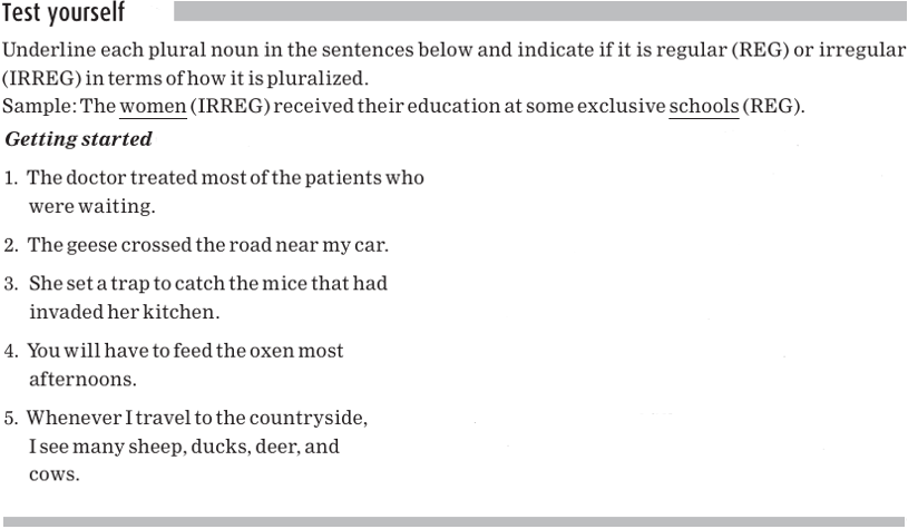 Usually, we pluralize a noun by adding an ‘‘s’’ to it, as in books; these nouns are called regular. There are a handful of nouns that are pluralized in other ways; these nouns are called irregular.
