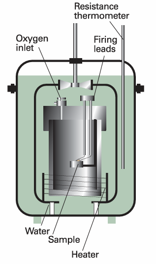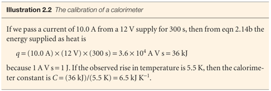 Calorimetry is the study of heat transfer during physical and chemical processes. A calorimeter is a device for measuring energy transferred as heat. The most common device for measuring ∆U is an adiabatic bomb calorimeter (Fig. 2.9). The process we wish to study—which may be a chemical reaction—is initiated inside a constant volume container, the ‘bomb’. The bomb is immersed in a stirred water bath, and the whole device is the calorimeter. The calorimeter is also immersed in an outer water bath. The water in the calorimeter and of the outer bath are both monitored and adjusted to the same temperature. This arrangement ensures that there is no net loss of heat from the calorimeter to the surroundings (the bath) and hence that the calorimeter is adiabatic. The change in temperature, ∆T, of the calorimeter is proportional to the heat that the reaction releases or absorbs. Therefore, by measuring ∆T we can determine qV and hence find ∆U. The conversion of ∆T to qV is best achieved by calibrating the calorimeter using a process of known energy output and determining the calorimeter constant, the constant C in the relation , q =C∆T , The calorimeter constant may be measured electrically by passing a constant current, I, from a source of known potential difference, V, through a heater for a known period of time, t, for then , q =IVt , Alternatively, C may be determined by burning a known mass of substance (benzoic acid is often used) that has a known heat output. With C known, it is simple to interpret an observed temperature rise as a release of heat.