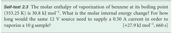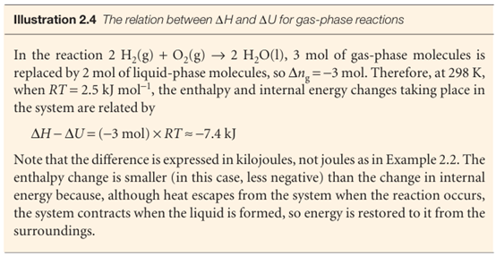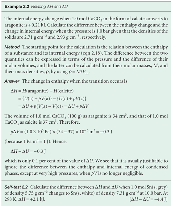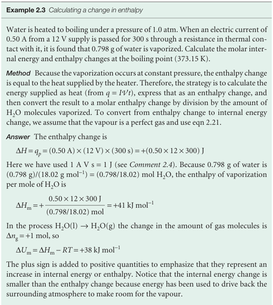 An enthalpy change can be measured calorimetrically by monitoring the temperature change that accompanies a physical or chemical change occurring at constant pressure. A calorimeter for studying processes at constant pressure is called an isobaric calorimeter. A simple example is a thermally insulated vessel open to the atmosphere: the heat released in the reaction is monitored by measuring the change in temperature of the contents. For a combustion reaction an adiabatic flame calorimeter may be used to measure ∆T when a given amount of substance burns in a supply of oxygen (Fig. 2.13). Another route to ∆His to measure the internal energy change by using a bomb calorimeter, and then to convert ∆U to ∆H. Because solids and liquids have small molar volumes, for them pVmis so small that the molar enthalpy and molar internal energy are almost identical (Hm=Um+pVm≈Um). Consequently, if a process involves only solids or liquids, the values of ∆H and ∆U are almost identical. Physically, such processes are accompanied by a very small change in volume, the system does negligible work on the surroundings when the process occurs, so the energy supplied as heat stays entirely within the system. The most sophisticated way to measure enthalpy changes, however, is to use a differential scanning calorimeter (DSC). Changes in enthalpy and internal energy may also be measured by noncalori metric methods (see Chapter 7).