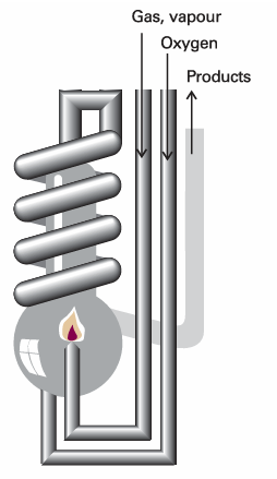 Fig. 2.13A constant-pressure flame calorimeter consists of this component immersed in a stirred water bath. Combustion occurs as a known amount of reactant is passed through to fuel the flame, and the rise of temperature is monitored. The enthalpy of a perfect gas is related to its internal energy by using pV=nRTin the definition of H: , H =U+pV=U+nRT , This relation implies that the change of enthalpy in a reaction that produces or consumes gas is