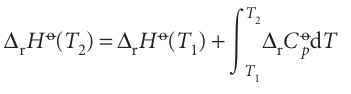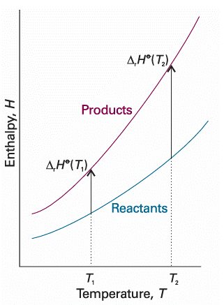 (We have assumed that no phase transition takes place in the temperature range of interest.) Because this equation applies to each substance in the reaction, the standard reaction enthalpy changes from ∆rHo(T1) to