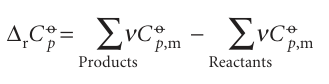 where ∆rCpo is the difference of the molar heat capacities of products and reactants under standard conditions weighted by the stoichiometric coefficients that appear in the chemical equation:
