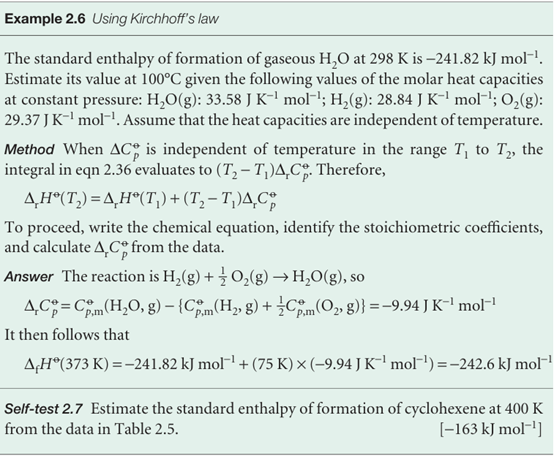 Equation 2.36 is known as Kirchhoff’s law. It is normally a good approximation to assume that ∆rCp is independent of the temperature, at least over reasonably limited ranges, as illustrated in the following example. Although the individual heat capacities may vary, their difference varies less significantly. In some cases the temperature dependence of heat capacities is taken into account by using eqn 2.25.