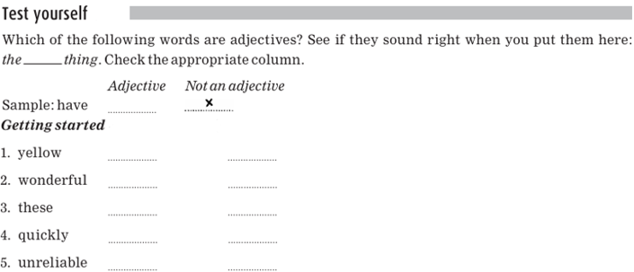 As you can see, each of these words passes the adjective test. Notice also that each of these words describes a characteristic of a noun.