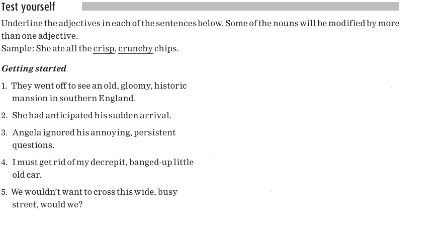 Another way of saying this is that they modify a noun. In the phrases we’ve just looked at, the underlined adjectives tell us something about, or modify, the noun boy.