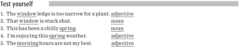 Remember that sometimes a word can function as one word category, or part of speech, in one sentence, and as another word category in another sentence (see Concrete and abstract nouns). For example, let’s look at the word cream. In the sentence I brought the cream, cream is a noun. But in the sentence That’s a cream cake, cream is an adjective, telling us more about the noun cake.