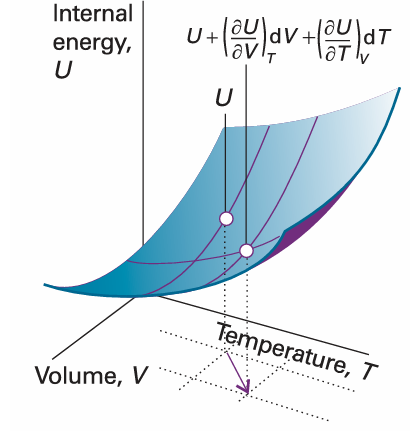 The coefficient (∂U/∂V) T, the slope of a plot of U against V at constant temperature, is the partial derivative of U with respect to V (Fig. 2.21). If, instead, T changes to T + dT at constant volume (Fig. 2.22), then the internal energy changes to