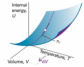 The interpretation of this equation is that, in a closed system of constant composition, any infinitesimal change in the internal energy is proportional to the infinitesimal changes of volume and temperature, the coefficients of proportionality being the two partial derivatives. In many cases partial derivatives have a straightforward physical interpretation, and thermodynamics gets shapeless and difficult only when that interpretation is not kept in sight. In the present case, we have already met (∂U/∂T) V in eqn 2.15, where we saw that it is the constant-volume heat capacity, CV. The other coefficient, (∂U/∂V) T, plays a major role in thermodynamics because it is a measure of the variation of the internal energy of a substance as its volume is changed at constant temperature (Fig. 2.24). We shall denote it πT and, because it has the same dimensions as pressure, call it the internal pressure: