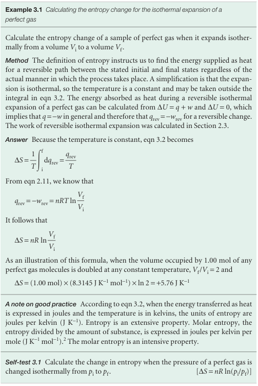 The thermodynamic definition of entropy concentrates on the change in entropy, dS, that occurs as a result of a physical or chemical change (in general, as a result of a ‘process’). The definition is motivated by the idea that a change in the extent to which energy is dispersed depends on how much energy is transferred as heat. As we have remarked, heat stimulates random motion in the surroundings. On the other hand, work stimulates uniform motion of atoms in the surroundings and so does not change their entropy. The thermodynamic definition of entropy is based on the expression , dS = dqrev /T , For a measurable change between two states i and f this expression integrates to
