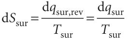 We can use the definition in eqn 3.1 to formulate an expression for the change in entropy of the surroundings, ∆Ssur. Consider an infinitesimal transfer of heat dqsur to the surroundings. The surroundings consist of a reservoir of constant volume, so the energy supplied to them by heating can be identified with the change in their internal energy, dUsur.3 The internal energy is a state function, and dUsur is an exact differential. As we have seen, these properties imply that dUsur is independent of how the change is brought about and in particular is independent of whether the process is reversible or irreversible. The same remarks therefore apply to dqsur, to which dUsur is equal. Therefore, we can adapt the definition in eqn 3.1 to write