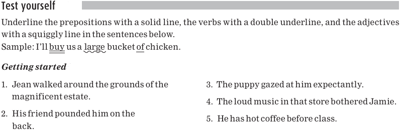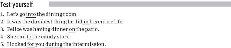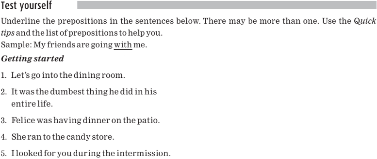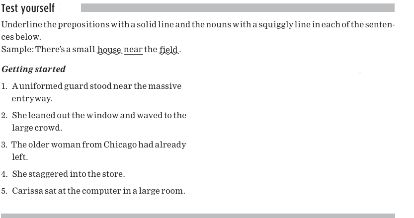 Prepositions are words, usually small, that typically indicate information about direction, location, or time. There is only a small number of prepositions in English. Some commonly used examples are at, from, in, on, and to.