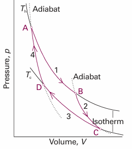 Fig. 3.6 The basic structure of a Carnot cycle. In Step 1, there is isothermal reversible expansion at the temperature Th. Step 2 is a reversible adiabatic expansion in which the temperature falls from Th to Tc. In Step 3 there is an isothermal reversible compression at Tc, and that isothermal step is followed by an adiabatic reversible compression, which restores the system to its initial state.