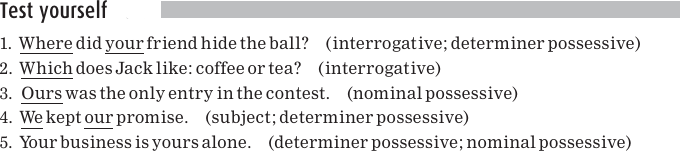 As we discussed at the beginning, interrogatives function as pronouns – they replace nouns. Note, however, that some interrogatives can also function as determiners - they can precede a noun. You can see this in the examples below: