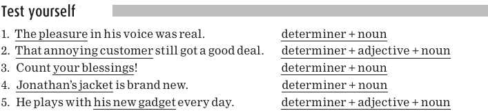 Here are some more examples with different determiners and nouns. (You may recall that the determiner always comes before the noun.) The whole noun phrase is underlined.