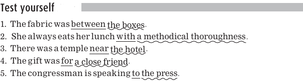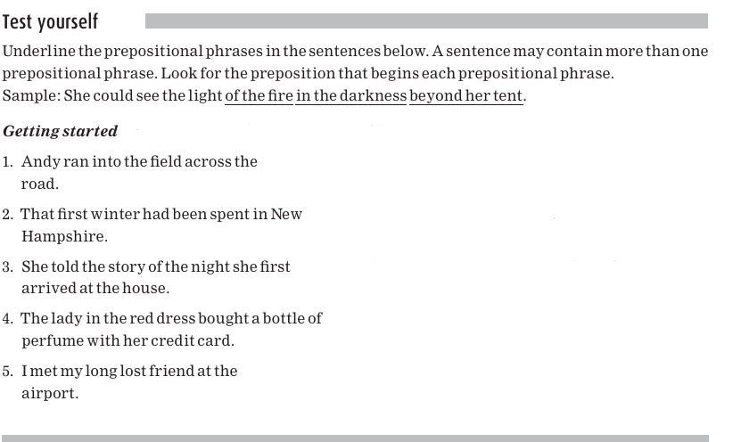 Each of these sentences contains a preposition, which is underlined. Here again are the common prepositions: