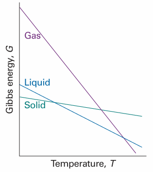 Fig. 3.19 The variation of the Gibbs energy with the temperature is determined by the entropy. Because the entropy of the gaseous phase of a substance is greater than that of the liquid phase, and the entropy of the solid phase is smallest, the Gibbs energy changes most steeply for the gas phase, followed by the liquid phase, and then the solid phase of the substance.