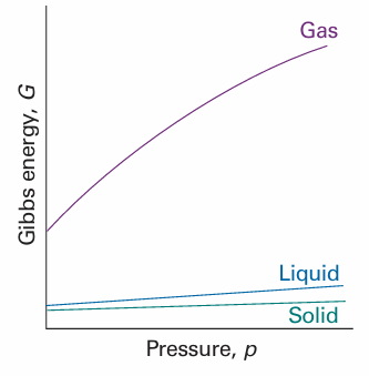 Because (∂G/∂p)T increases with V,Gis more sensitive to pressure when the volume of the system is large. Because the molar volume of the gaseous phase of a substance is greater than that of its condensed phases, the molar Gibbs energy of a gas is more sensitive to pressure than its liquid and solid phases (Fig. 3.20).