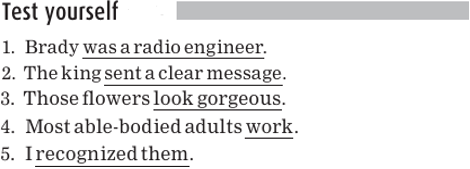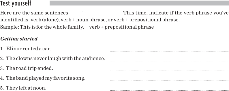 Have you noticed anything that all the underlined verb phrases in sentences 1-5 have in common? Each verb phrase has a verb. In fact, in sentence 1, the verb phrase has nothing in it but a verb, left. A verb phrase may also have other words, as you can see in sentences 2-5, but the least that every verb phrase has to have is a verb.