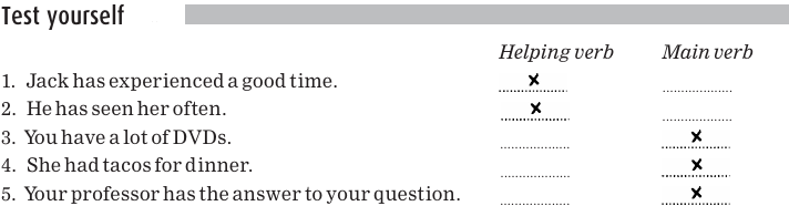 One kind of helping verb is the verb have. It has three forms: have, has, and had.
