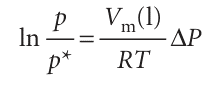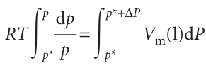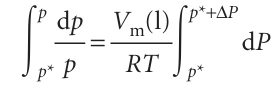 We can integrate this expression once we know the limits of integration. When there is no additional pressure acting on the liquid, P (the pressure experienced by the liquid) is equal to the normal vapour pressure p*, so when P = p*, p = p* too. When there is an additional pressure ∆P on the liquid, with the result that P=p+∆P, the vapour pressure is p (the value we want to find). Provided the effect of pressure on the vapour pressure is small (as will turn out to be the case) a good approximation is to replace the p in p +∆P by p* itself, and to set the upper limit of the integral to p* +∆P. The integrations required are therefore as follows: