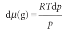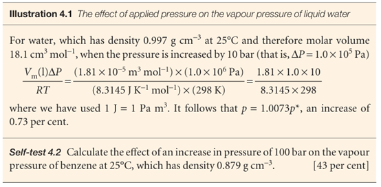 Justification 4.1 The vapour pressure of a pressurized liquid We calculate the vapour pressure of a pressurized liquid by using the fact that at equilibrium the chemical potentials of the liquid and its vapour are equal: µ(l) = µ(g). It follows that, for any change that preserves equilibrium, the resulting change in µ(l) must be equal to the change in µ(g); therefore, we can write dµ(g) = dµ(l). When the pressure P on the liquid is increased by dP, the chemical potential of the liquid changes by dµ(l) = Vm(l)dP. The chemical potential of the vapour changes by dµ(g)=Vm(g)dp where dp is the change in the vapour pressure we are trying to find. If we treat the vapour as a perfect gas, the molar volume can be replaced by Vm(g) = RT/p, and we obtain