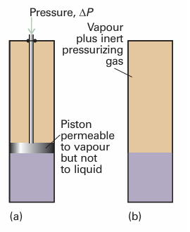 Fig. 4.11 Pressure may be applied to a condensed phases either (a) by compressing the condensed phase or (b) by subjecting it to an inert pressurizing gas. When pressure is applied, the vapour pressure of the condensed phase increases.