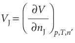 Imagine a huge volume of pure water at 25°C. When a further 1 mol H2O is added, the volume increases by 18 cm3 and we can report that 18 cm3mol−1is the molar volume of pure water. However, when we add 1 mol H2O to a huge volume of pure ethanol, the volume increases by only 14 cm3. The reason for the different increase in volume is that the volume occupied by a given number of water molecules depends on the identity of the molecules that surround them. In the latter case there is so much ethanol present that each H2O molecule is surrounded by ethanol molecules, and the packing of the molecules results in the H2O molecules increasing the volume by only 14 cm3. The quantity 14 cm3 mol−1 is the partial molar volume of water in pure ethanol. In general, the partial molar volume of a substance A in a mixture is the change in volume per mole of A added to a large volume of the mixture. The partial molar volumes of the components of a mixture vary with composition because the environment of each type of molecule changes as the composition changes from pure A to pure B. It is this changing molecular environment, and the consequential modification of the forces acting between molecules, that results in the variation of the thermodynamic properties of a mixture as its composition is changed. The partial molar volumes of water and ethanol across the full composition range at 25°C are shown in Fig. 5.1. The partial molar volume, VJ, of a substance J at some general composition is defined formally as follows: