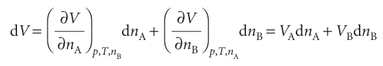 where the subscript n′ signifies that the amounts of all other substances present are constant.1 The partial molar volume is the slope of the plot of the total volume as the amount of J is changed, the pressure, temperature, and amount of the other components being constant (Fig. 5.2). Its value depends on the composition, as we saw for water and ethanol. The definition in eqn 5.1 implies that, when the composition of the mixture is changed by the addition of dnA of A and dnB of B, then the total volume of the mixture changes by