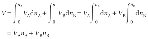 Provided the composition is held constant as the amounts of A and B are increased, the final volume of a mixture can be calculated by integration. Because the partial molar volumes are constant (provided the composition is held constant throughout the integration) we can write