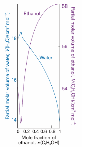 Fig. 5.1 The partial molar volumes of water and ethanol at 25°C. Note the different scales (water on the left, ethanol on the right).