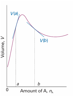 Fig. 5.2 The partial molar volume of a substance is the slope of the variation of the total volume of the sample plotted against the composition. In general, partial molar quantities vary with the composition, as shown by the different slopes at the compositions a and b. Note that the partial molar volume at b is negative: the overall volume of the sample decreases as A is added.