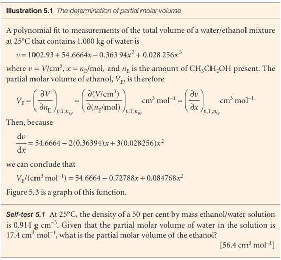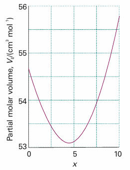 Although we have envisaged the two integrations as being linked (in order to preserve constant composition), because V is a state function the final result in eqn 5.3 is valid however the solution is in fact prepared. Partial molar volumes can be measured in several ways. One method is to measure the dependence of the volume on the composition and to fit the observed volume to a function of the amount of the substance. Once the function has been found, its slope can be determined at any composition of interest by differentiation.