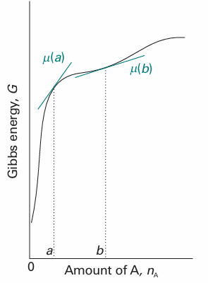 Fig. 5.4 The chemical potential of a substance is the slope of the total Gibbs energy of a mixture with respect to the amount of substance of interest. In general, the chemical potential varies with composition, as shown for the two values at a and b. In this case, both chemical potentials are positive.