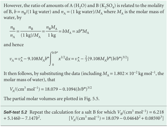 The same line of reasoning applies to all partial molar quantities. We can see in Fig. 5.1, for example, that, where the partial molar volume of water increases, that of ethanol decreases. Moreover, as eqn 5.13 shows, and as we can see from Fig. 5.1, a small change in the partial molar volume of A corresponds to a large change in the partial molar volume of B if nA/nB is large, but the opposite is true when this ratio is small. In practice, the Gibbs–Duhem equation is used to determine the partial molar volume of one component of a binary mixture from measurements of the partial molar volume of the second component.