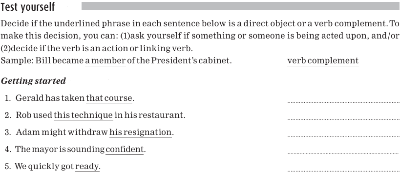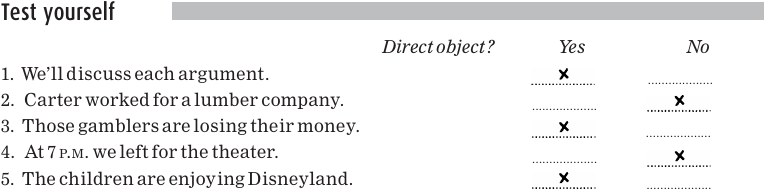 As we saw, a noun phrase can function as the subject of a sentence. A noun phrase can also have other functions. For example, a noun phrase maybe acted upon by the subject and follow the verb. These noun phrases are called direct objects. The direct objects in the sentences below are underlined: