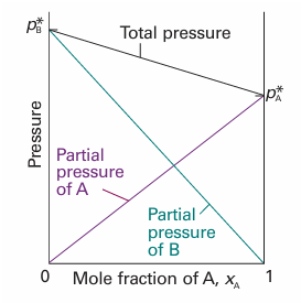 Fig. 5.11 The total vapour pressure and the two partial vapour pressures of an ideal binary mixture are proportional to the mole fractions of the components.